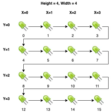 Section titled “Default”The default pixel mapper assumes that the led matrix is addressed starting with the top left LED, moving to the right, and then starting with the left-most row of the next row.